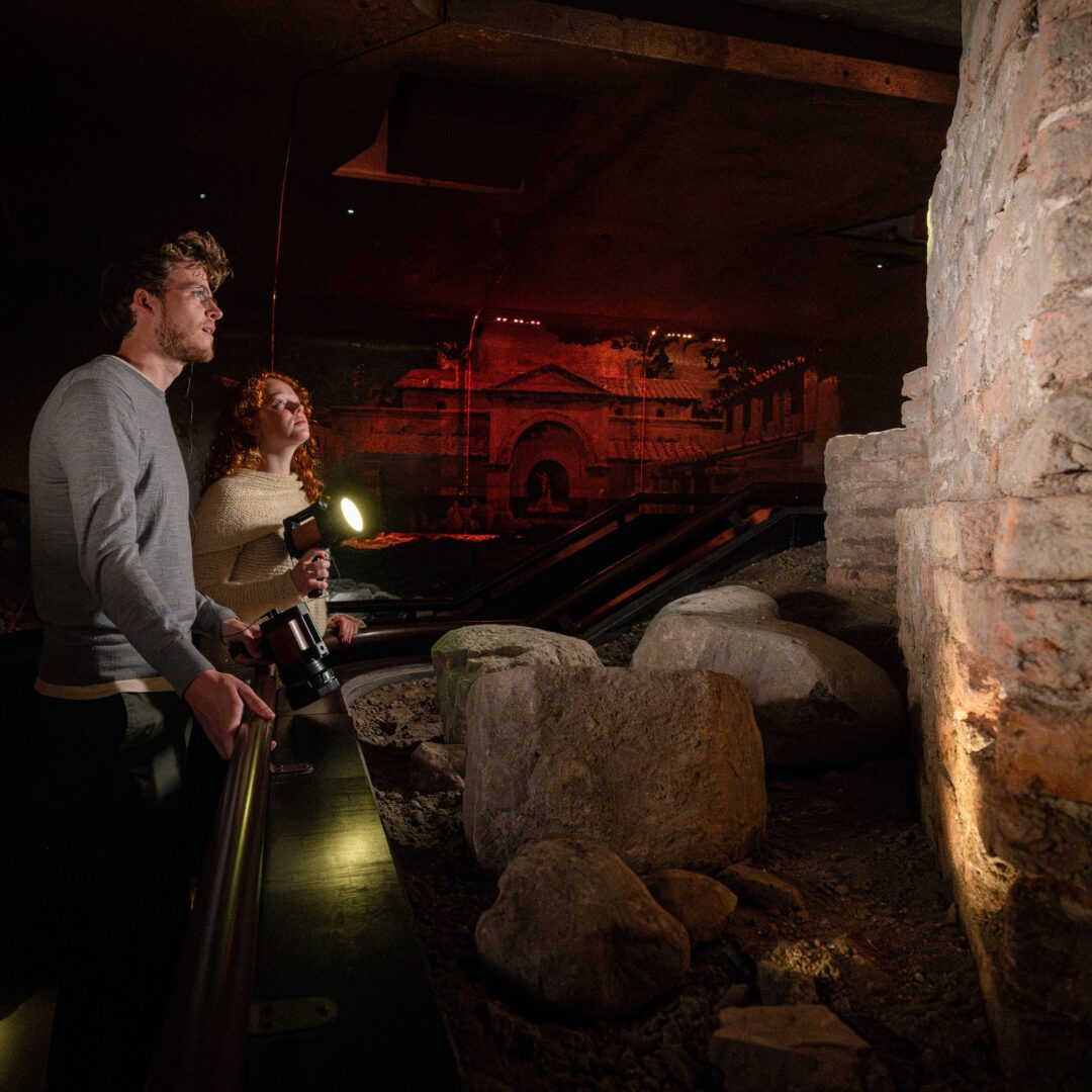 DOMunder is de prijswinnende historische attractie onder het Domplein in Utrecht voor jong en oud. Pak de slimme zaklamp en ga op een ondergrondse Ontdekkingstocht vol spannende verhalen en archeologische schatten. Ontdek het Romeinse verleden van Utrecht, evenals de roemrijke middeleeuwen. Beleef de verwoestende storm van 1674 waarbij het schip van de Domkerk instorte en het Domplein ontstond.